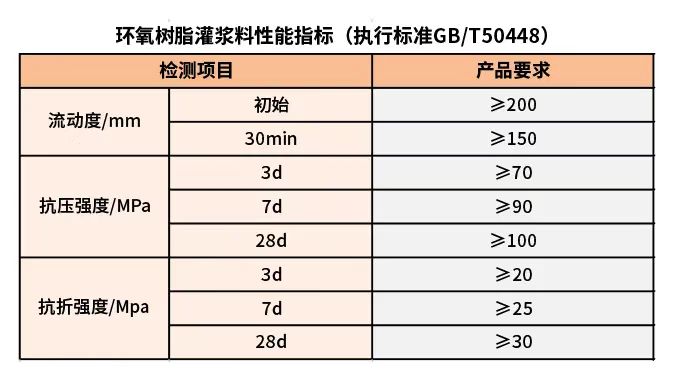 环氧树脂灌浆料参照GB/T50448《水泥基灌浆材料应用技术规范》,性能指标如下: